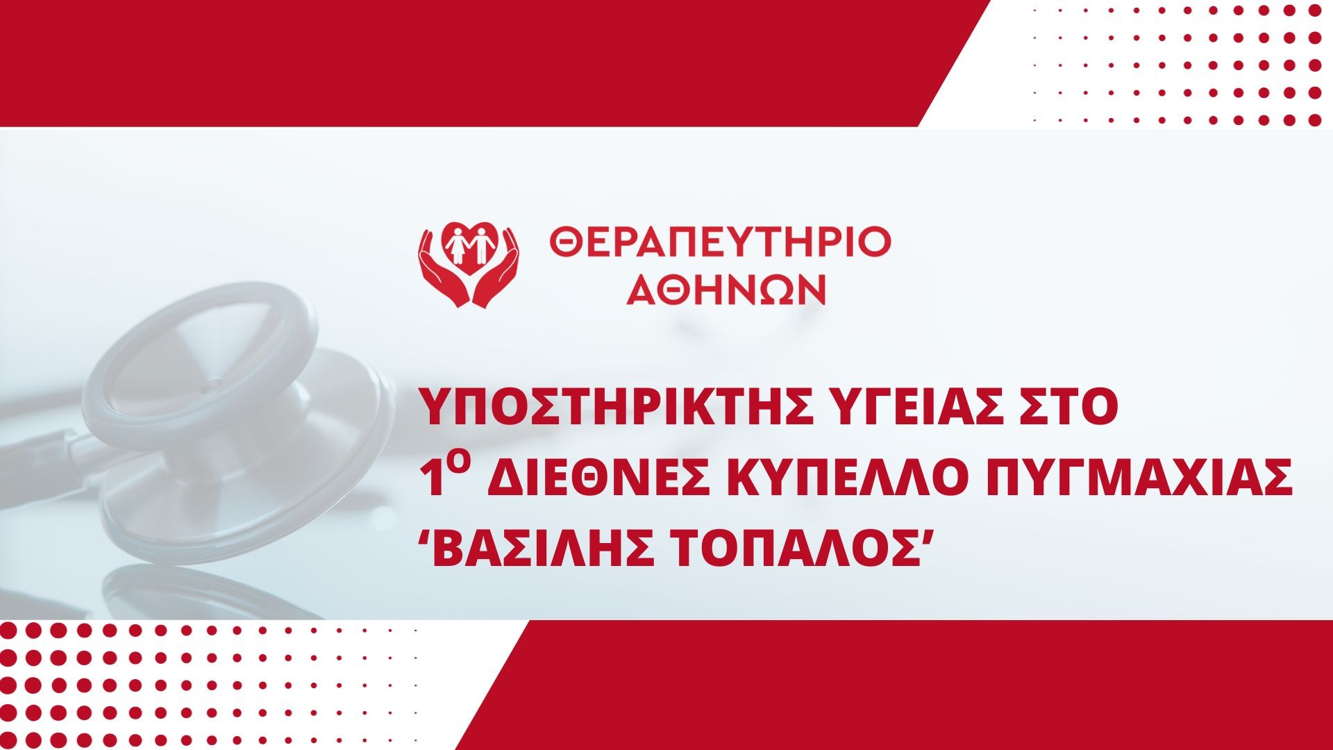 Το ΘΕΡΑΠΕΥΤΗΡΙΟ ΑΘΗΝΩΝ παρείχε ολοκληρωμένη Ιατρική και Νοσηλευτική Κάλυψη καθώς και διακομιδή και παροχή πρώτων βοηθειών σε περίπτωση ανάγκης. «Η προσφορά προς τον συνάνθρωπο και η ανάδειξη της αξίας του αθλητισμού αποτελούν βασικές επιδιώξεις του ΘΕΡΑΠΕΥΤΗΡΙΟΥ ΑΘΗΝΩΝ. Ήταν τιμή μας να είμαστε αρωγοί με τις υπηρεσίες μας σε αυτή την αξιόλογη διοργάνωση του 1ου Διεθνούς Κυπέλλου Πυγμαχίας.» δήλωσε η κυρία Βανέσα Δεληχρήστου, Γενική Διευθύντρια του Θεραπευτηρίου Αθηνών.